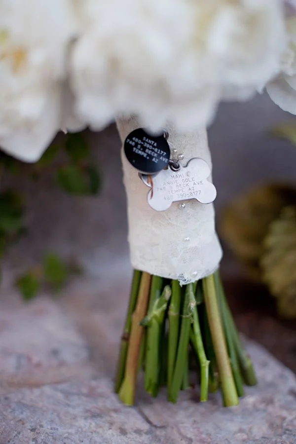 If it's simply not possible to have your dog with you at the wedding, why not walk down the aisle with their tags on your bouquet?