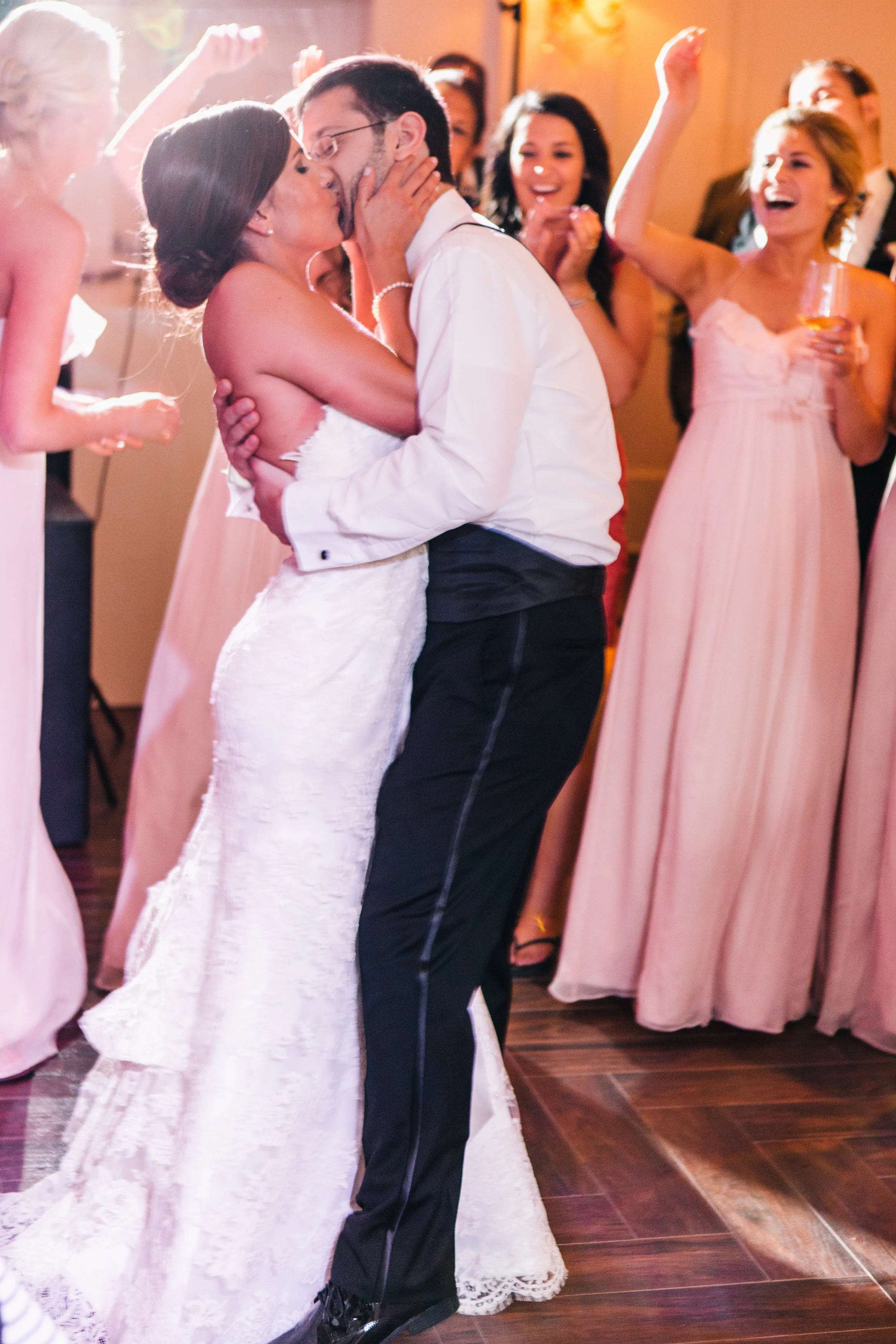 Blush pink and gold were their colors with the girls in floor length blush gowns and the groom and groomsmen in dashing, classic black tuxedos and bowties. The bride wore a lovely lace confection from Joan Pillow Salon. Her veil was her "Something Borrowed" from her best friend, newlywed Kimmie.