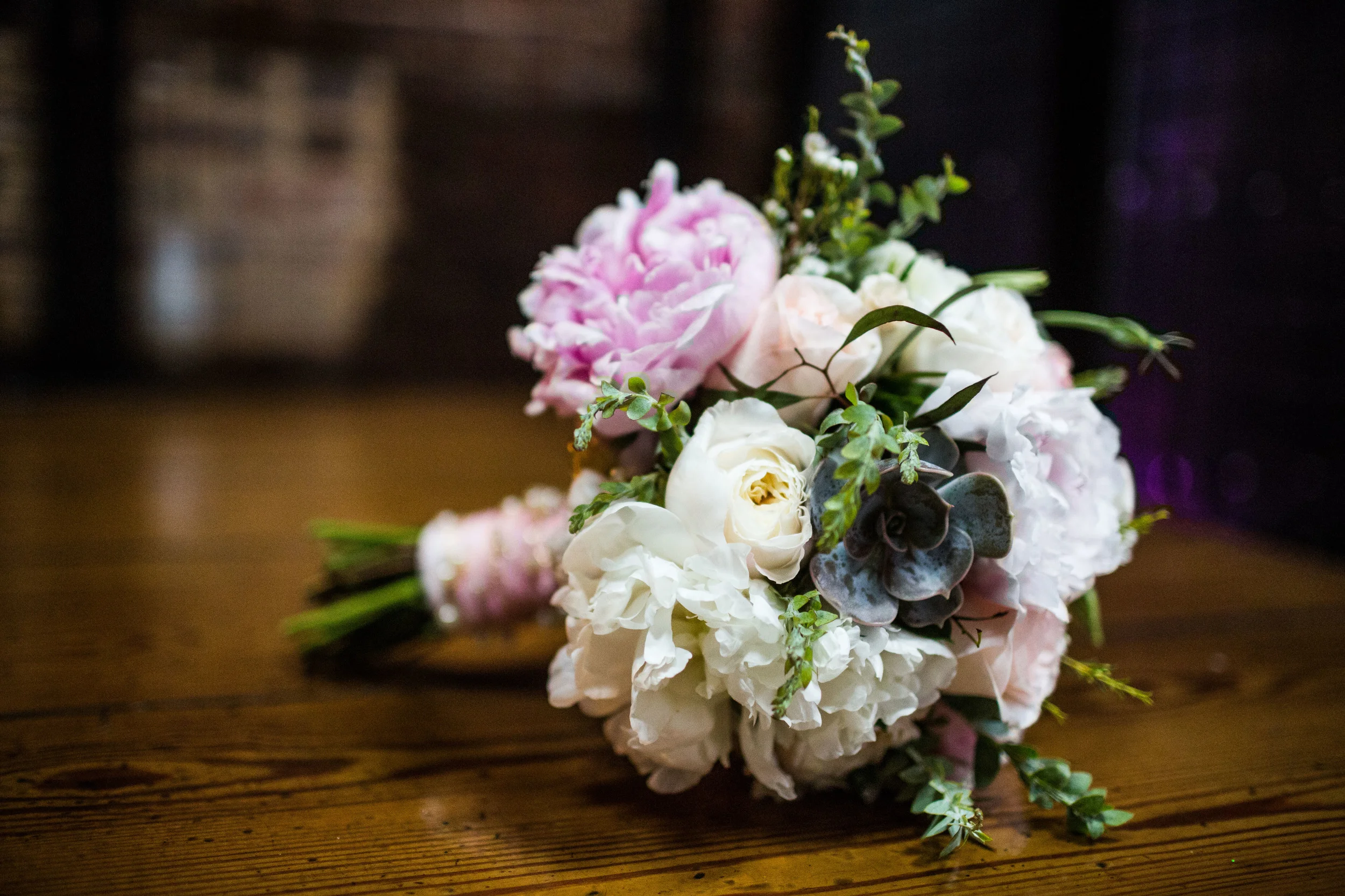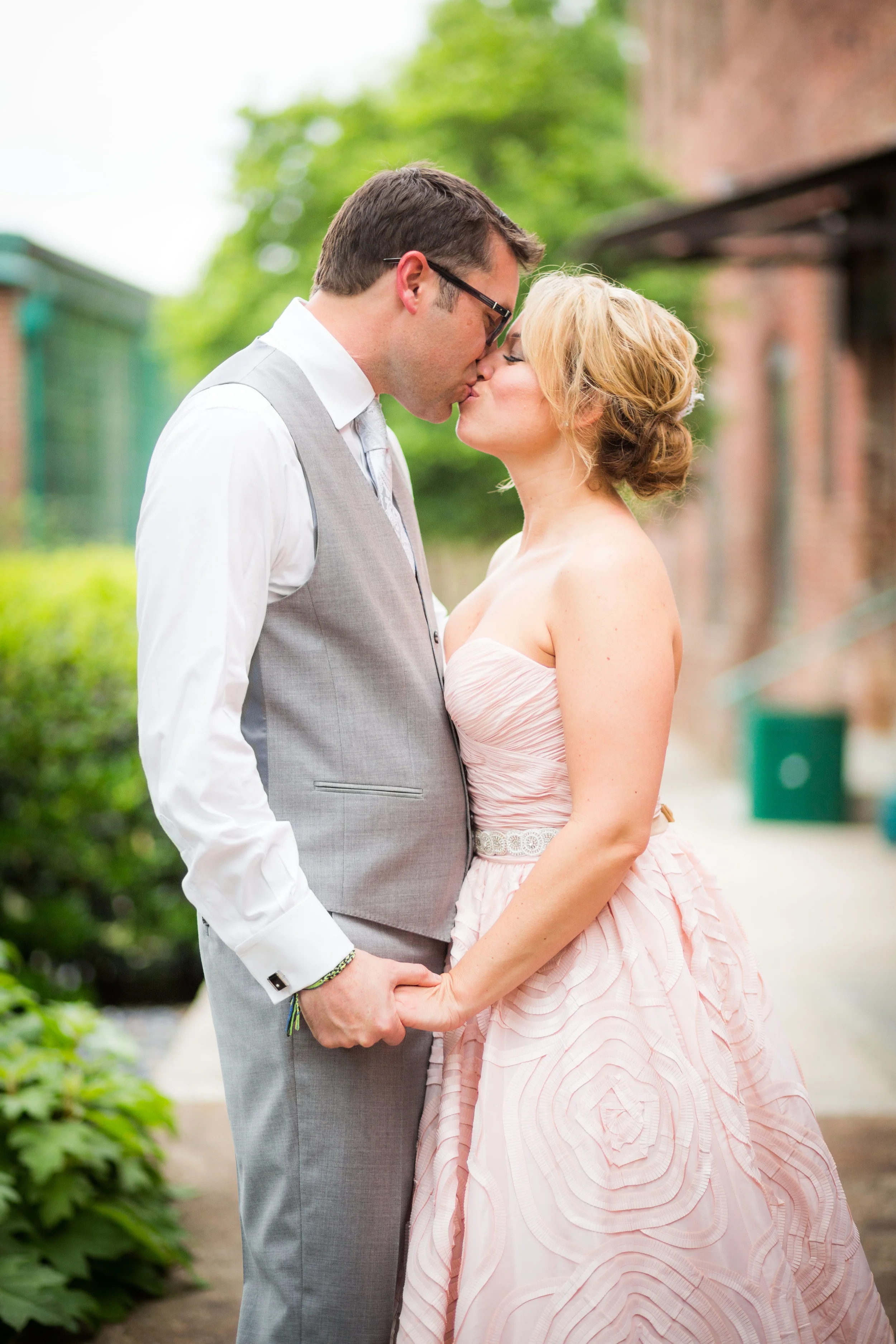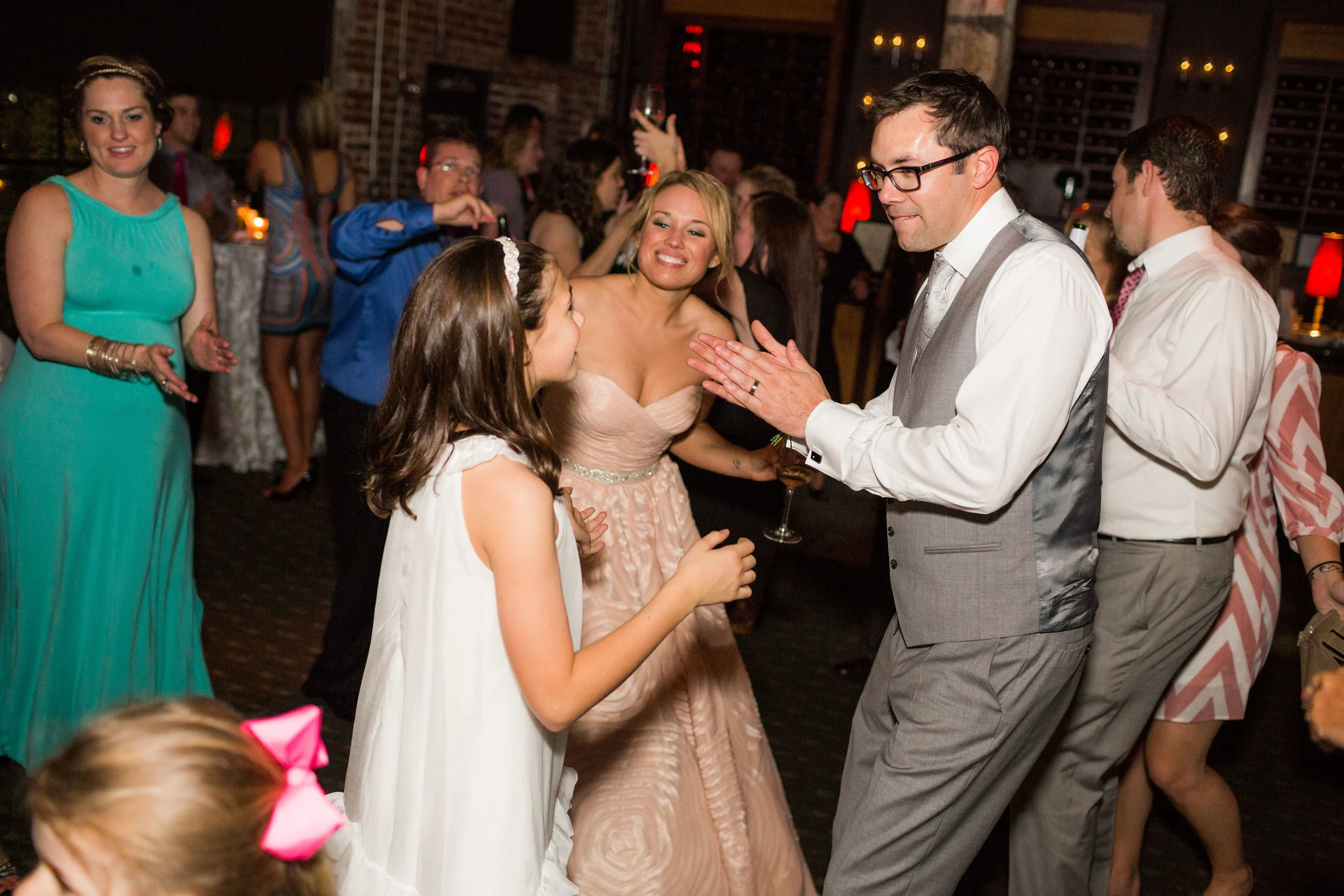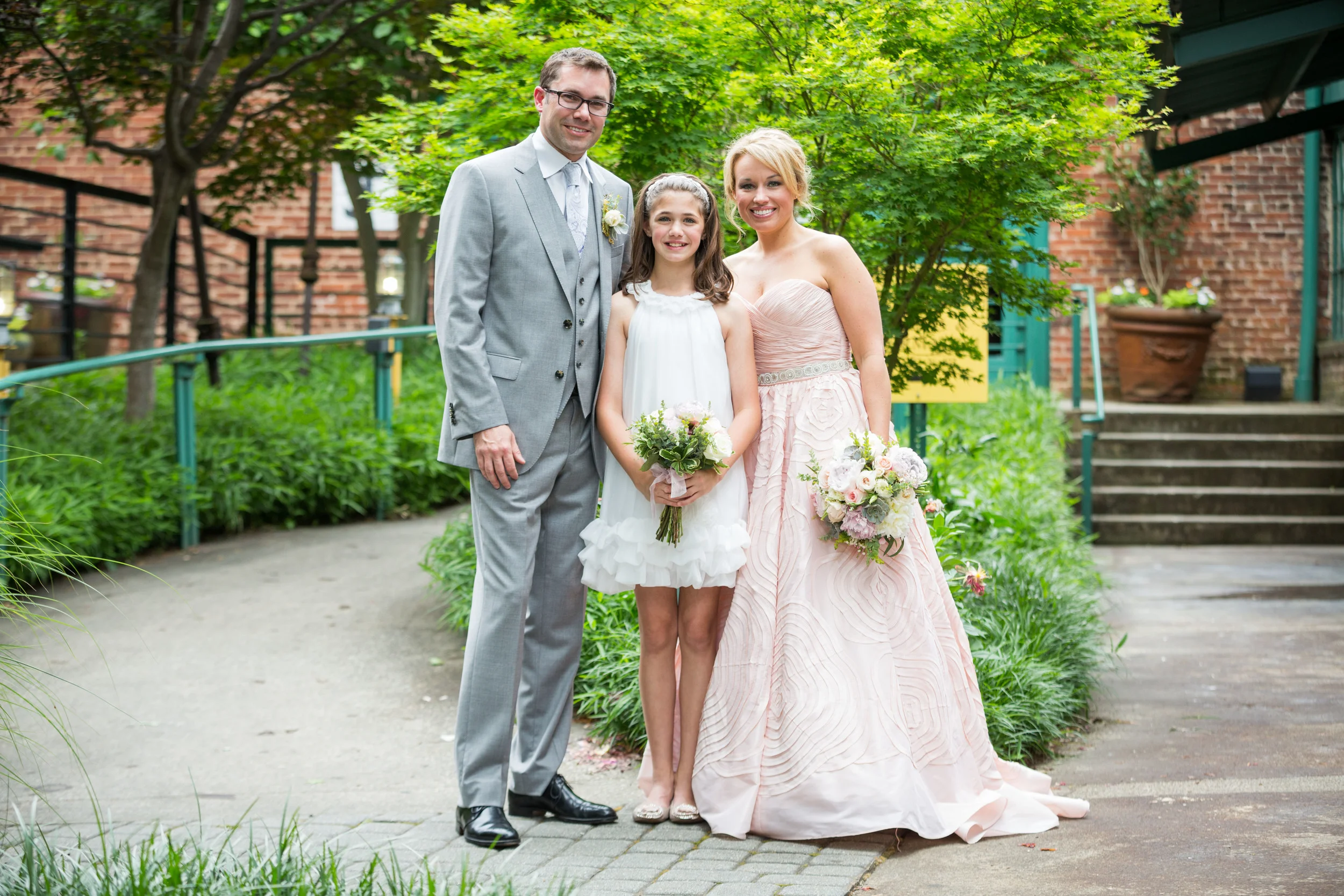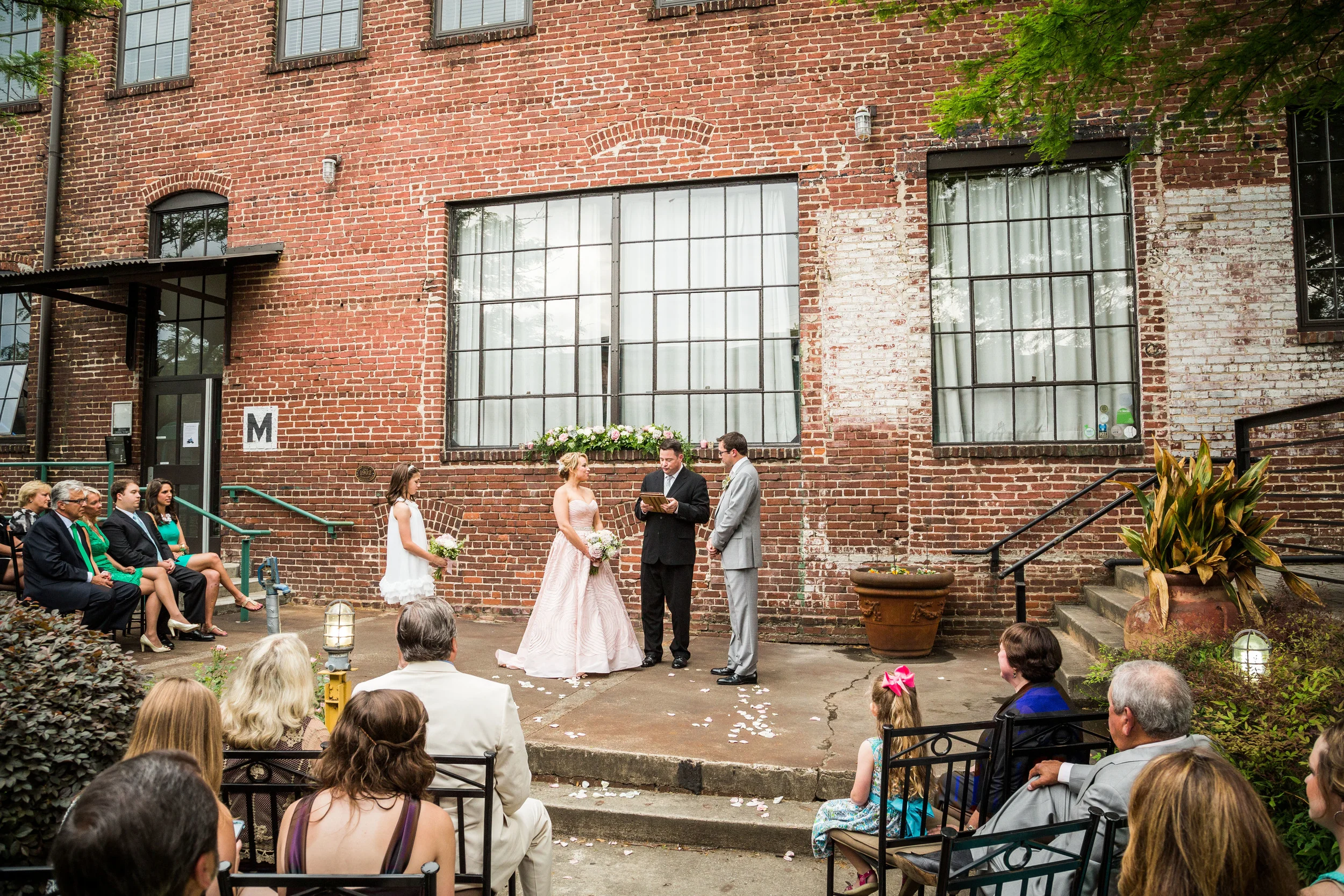 Kellie and Ben wed on May 10th at Studio 877, in the King Plow Arts Center in Atlanta, Georgia. Their wedding was simple, heartfelt and sweet. Blush pink, mercury silver, & glittering gold were the colors of romance. The bride wore a gorgeous blush pink gown with a beaded belt from Anthropologie with Valentino heels. The one and only bridesmaid was her future step daughter, Julia, perfectly outfitted in white. The couple had a "family" ceremony. This meant that the vows weren't only to each other, but also to Julia, promising that they would be a family! Kellie even presented Julia with a special necklace during the exchanging of the rings. Seriously, how sweet!!!