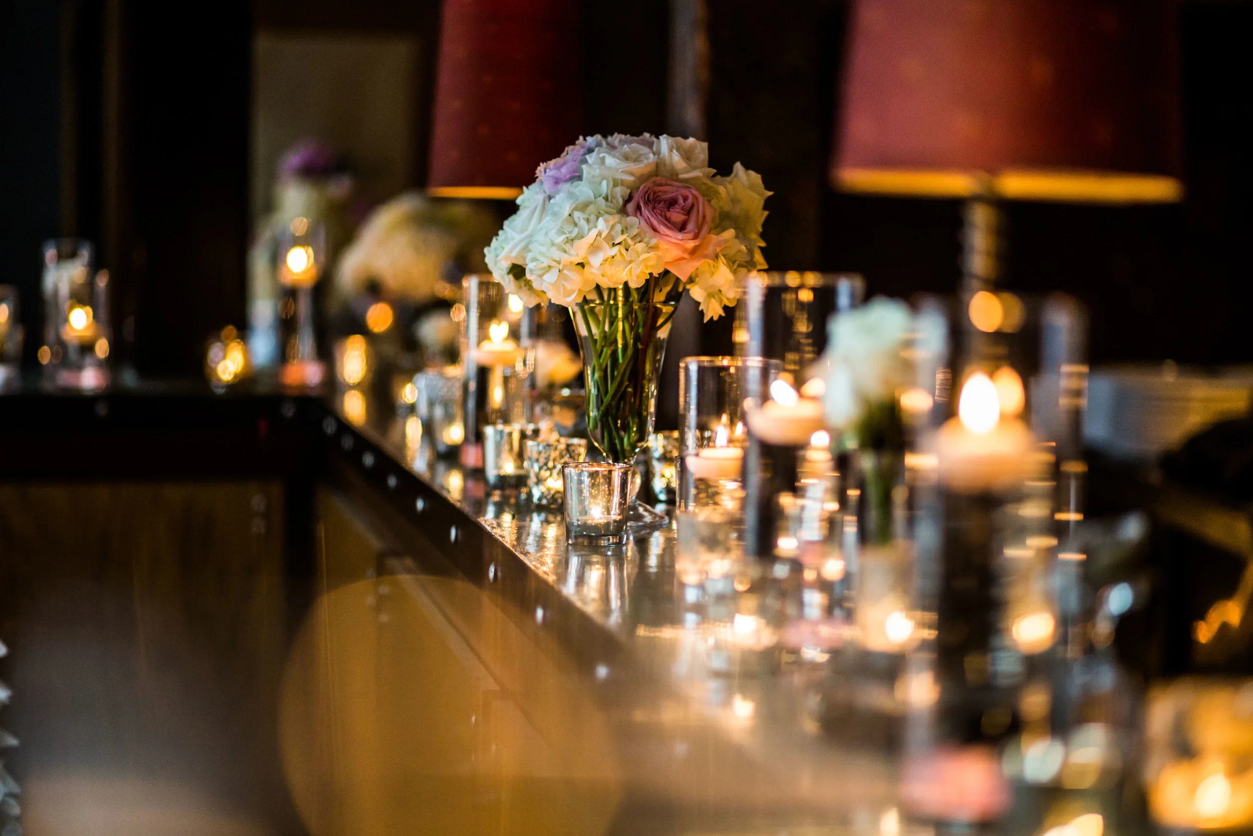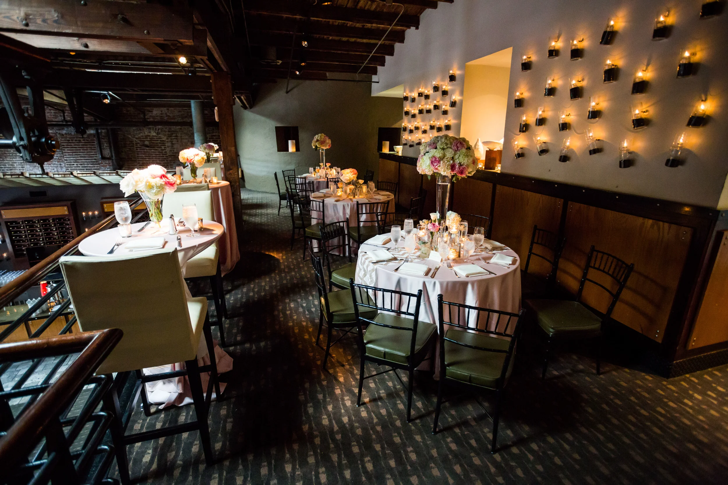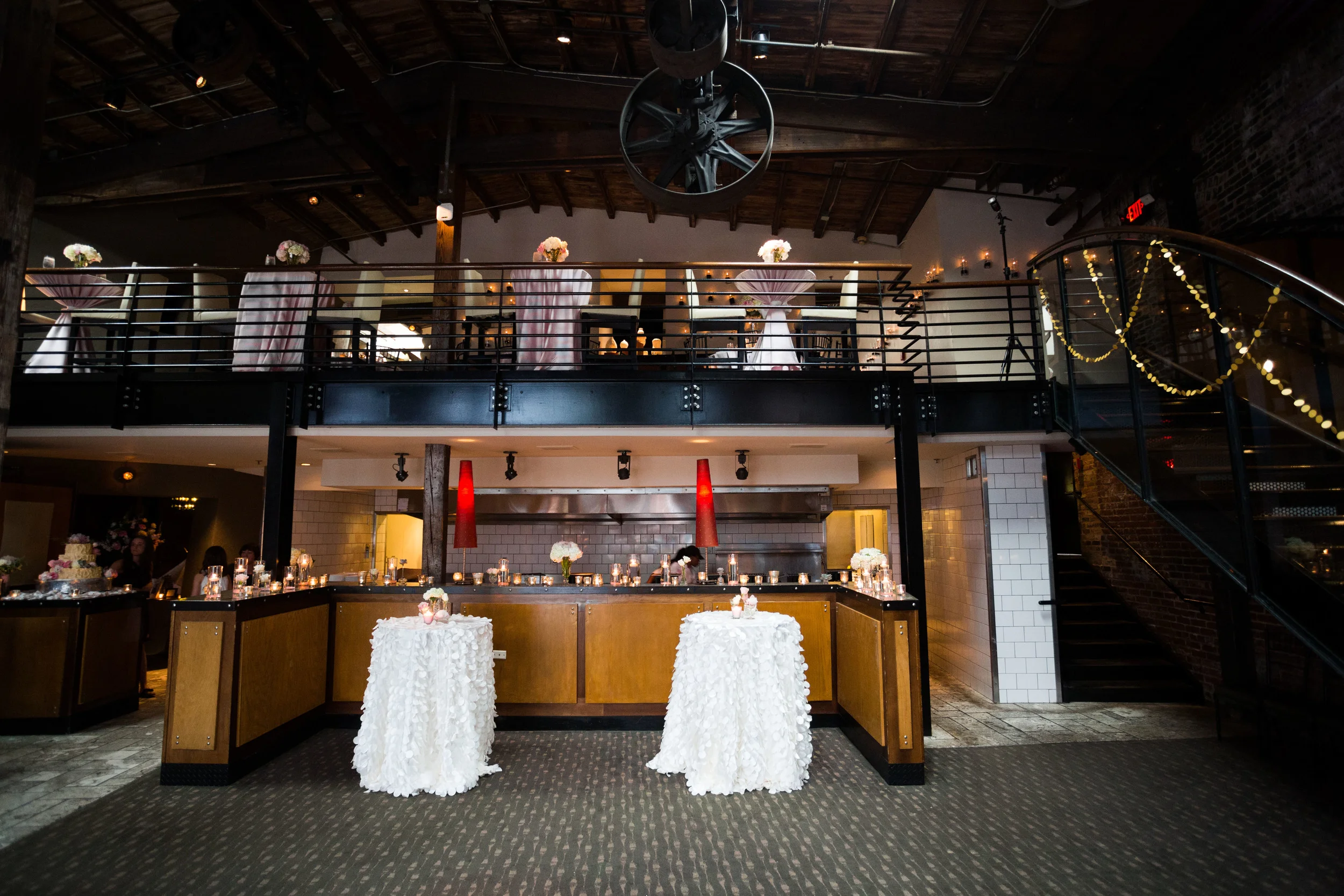 The wide open, industrial space was warmed up with blush and sequined linens a front and center sequined sweetheart table for the bride and groom, lots of flickering candles, flowers, and some fun textured linens.