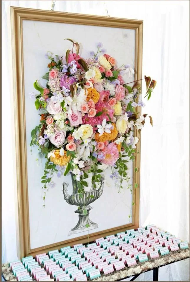 What do you do when you've only got a small space to display your escort cards? Utilize the wall! Why not incorporate flowers from your bouquet and the tables into one of the most unique displays we've ever seen?