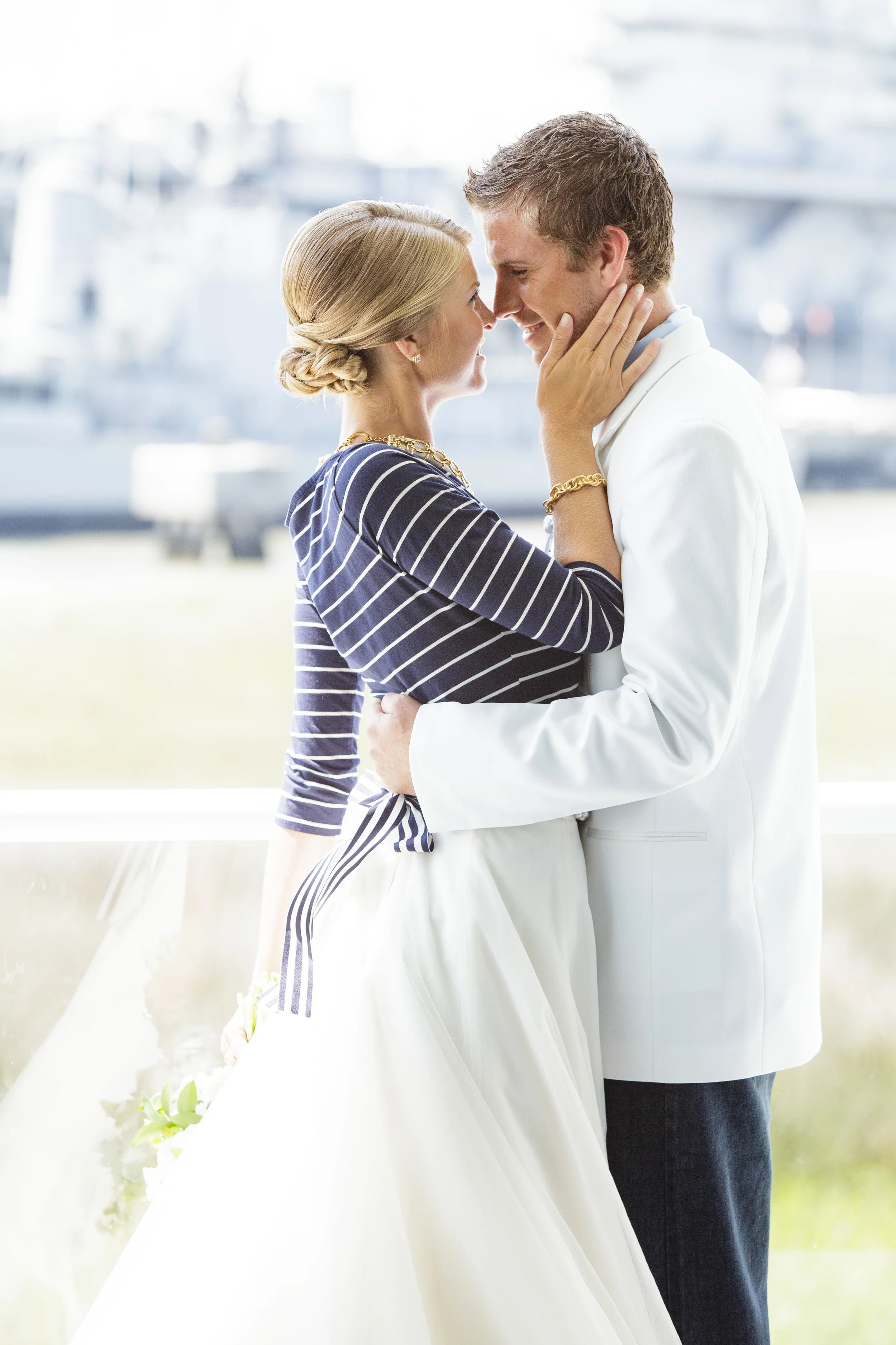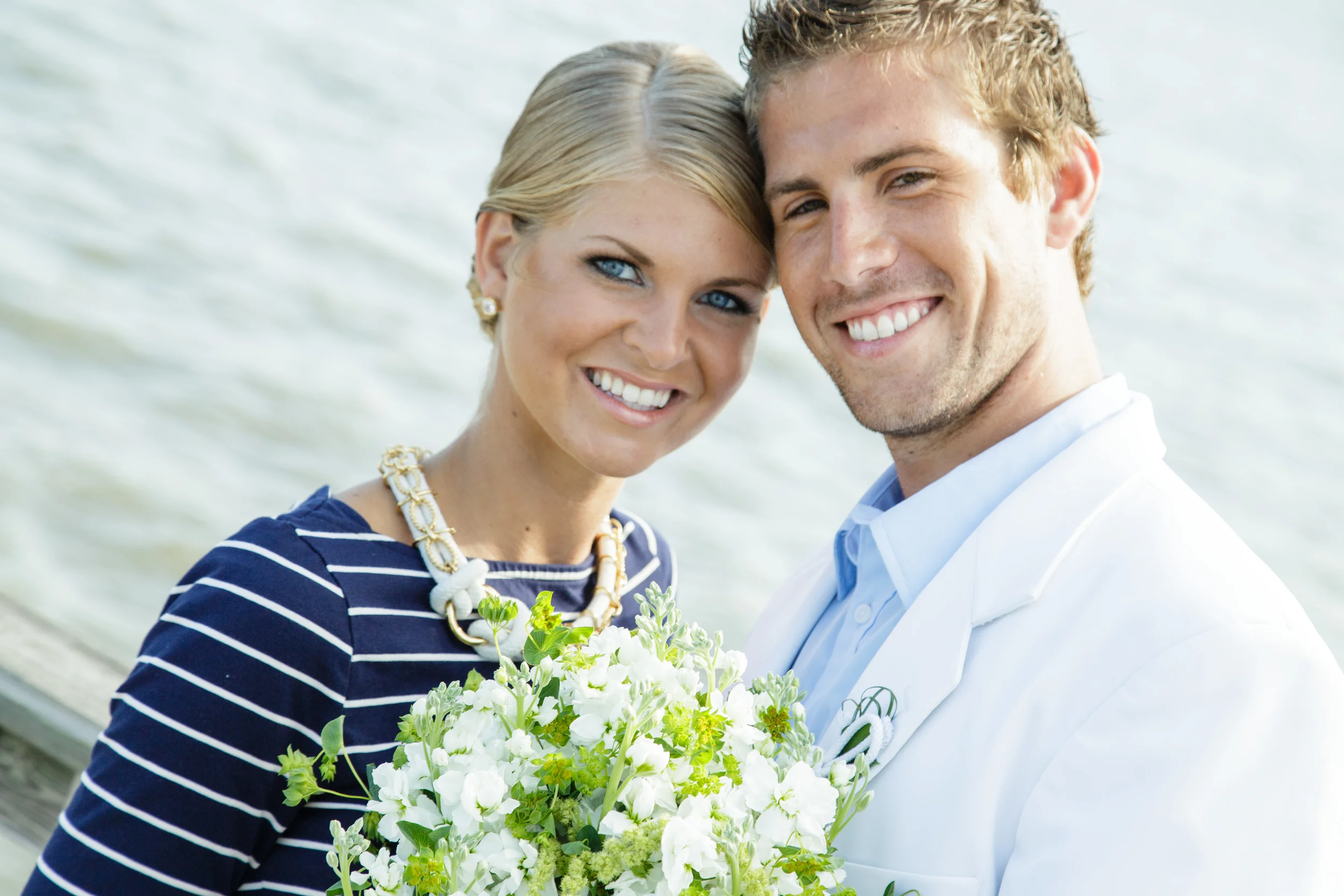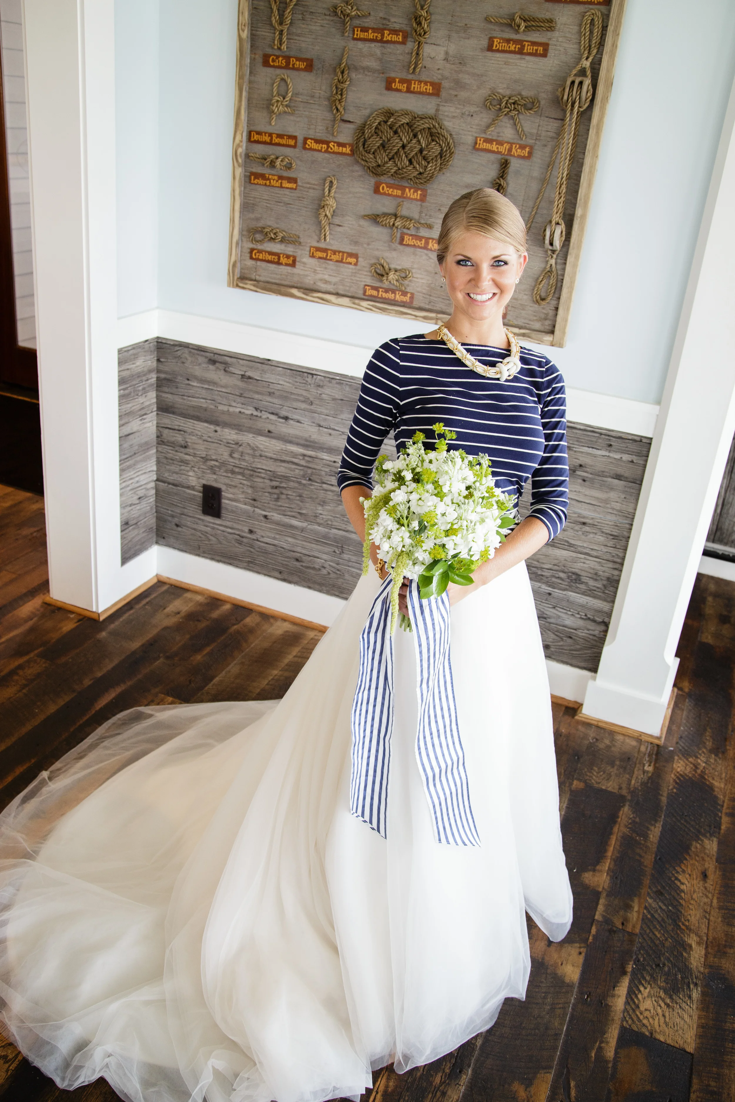 I wanted to do something completely off the wall but still wearable for the bride's gown so I paired a huge tulle ball-gown skirt from Gown Boutique of Charleston with a navy and white striped top from Target! When we started getting Kristen dressed we realized that we needed a belt around her waist so Alden used a fabulous pearl necklace wrapped in a grosgrain navy and white striped ribbon and it was perfect! And don't even get me started on how much I adore that rope necklace!