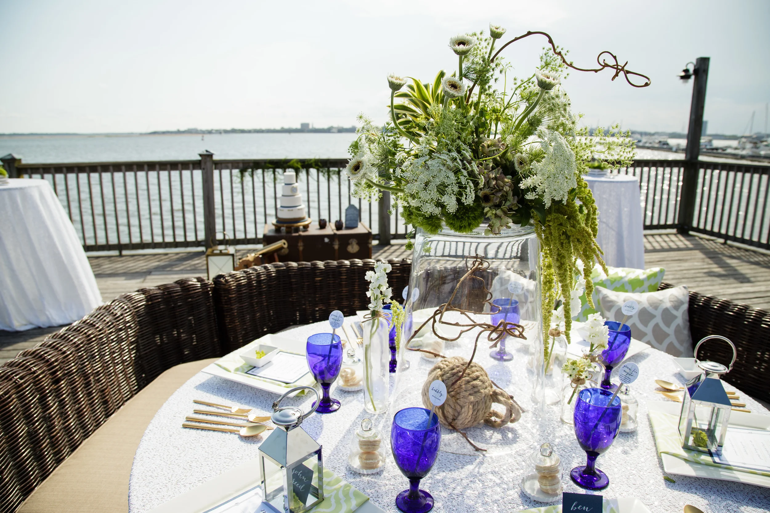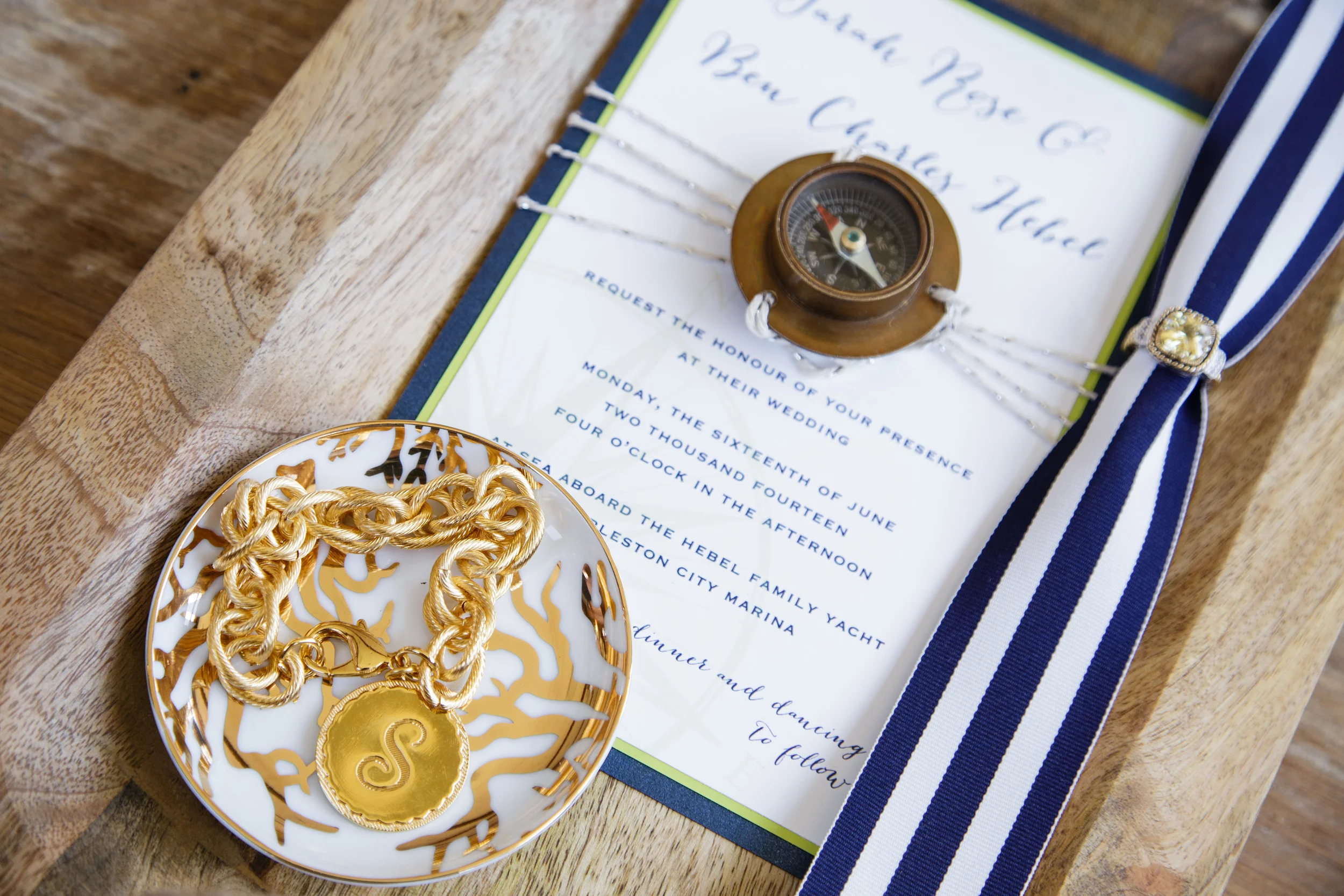 “Considering a sandy shores abound in the Lowcountry, it’s no shock that Charleston-based shutterbug Mackenzie Clark (aka the Click Chick) and Sara Skinner of Scarlet Plan & Design share an affinity for all things nautical. When an itch to highlight that aesthetic struck recently, the pair fashioned an inspiration shoot at the Charleston Harbor Resort & Marina bursting with maritime touches—from boat shoes to a compass-bound stationery suite. The result? A faux wedding any sea-loving couple would yen for. “Couples should look into their own lives and loves for inspiration,” says Sara. “If they stay true to the things that matter to them, the wedding will be unique and memorable.””