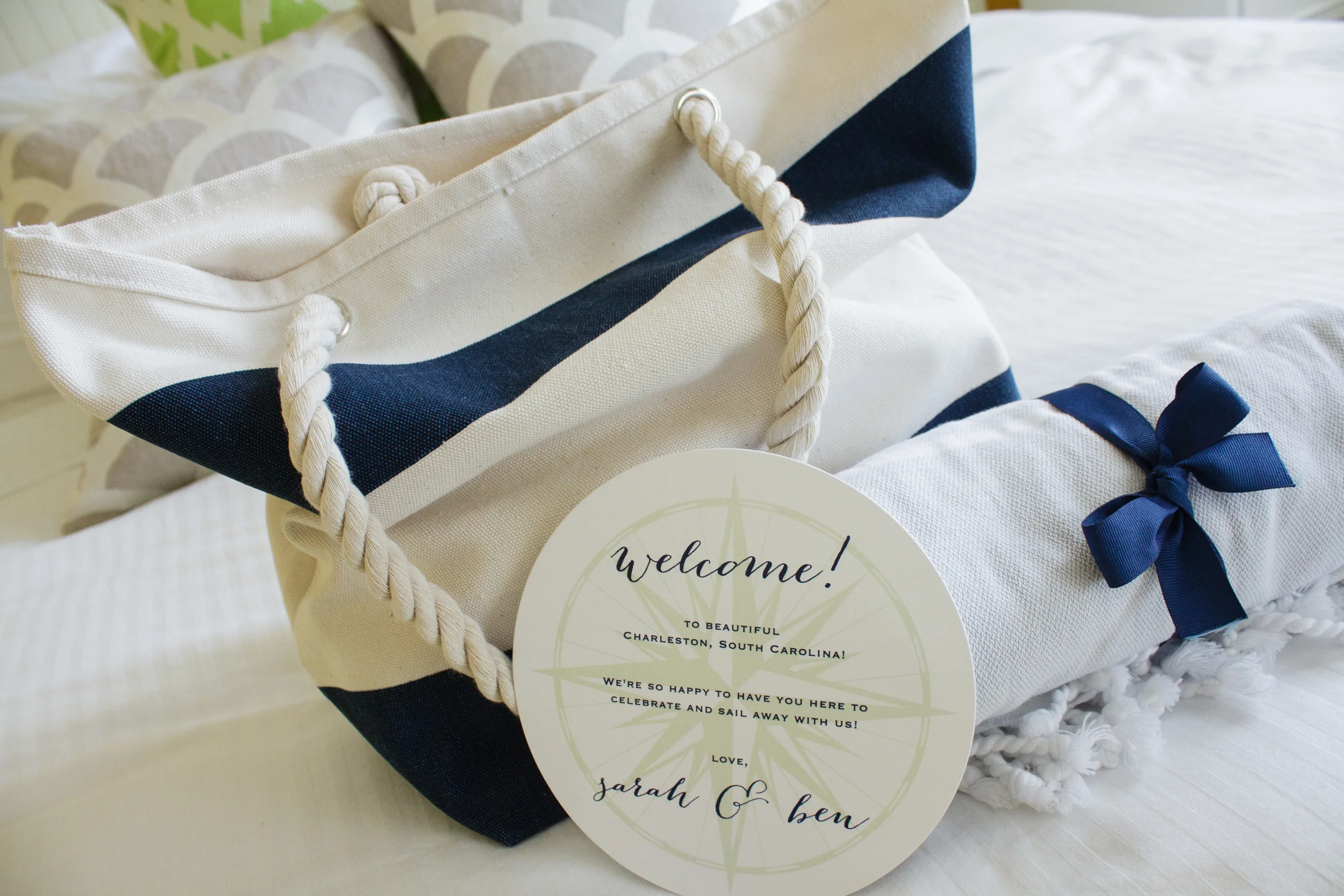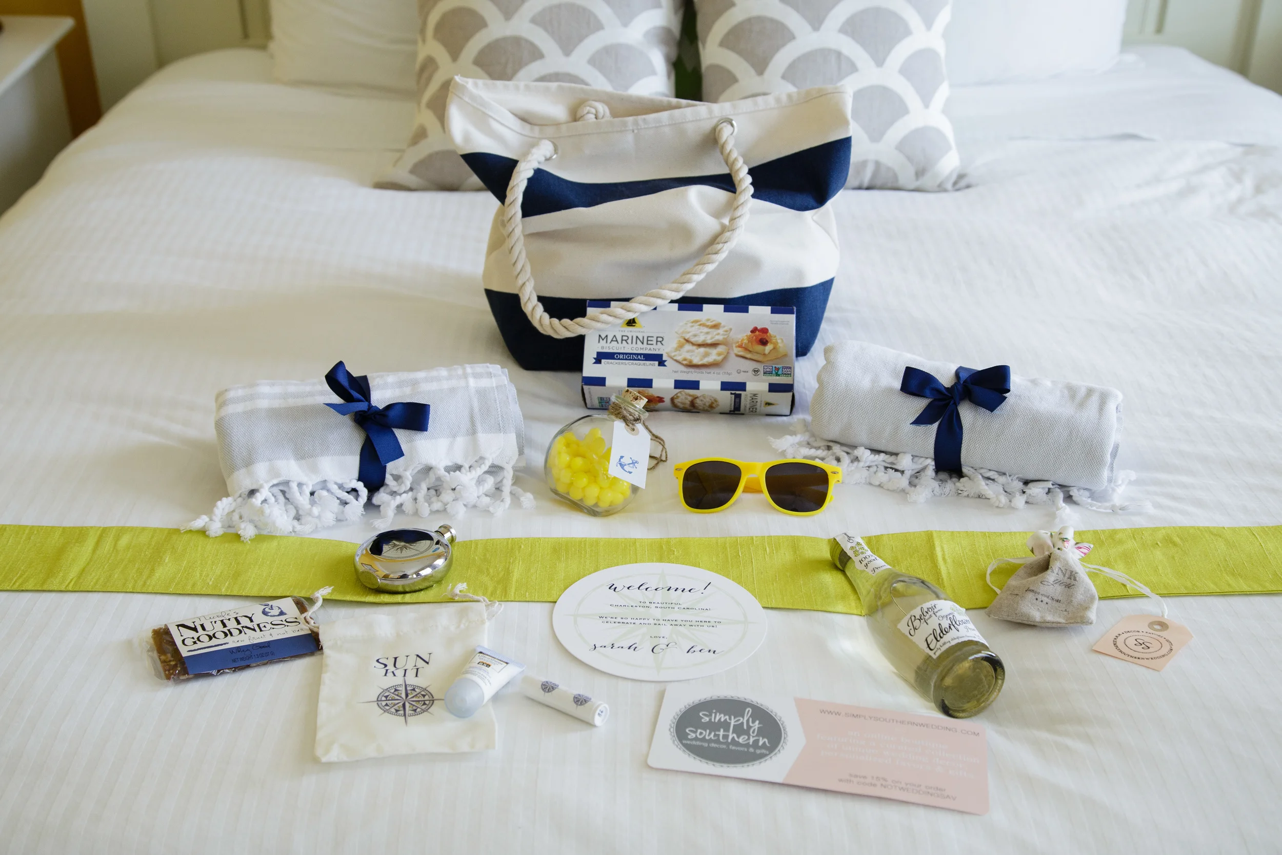 The gals at A Signature Welcome worked with us to craft a welcome bag we'd LOVE to give our own guests! They used our color palette paired with perfectly curated gifts sure to make your guests feel welcomed and at ease during their weekend in the sun with you at your wedding!