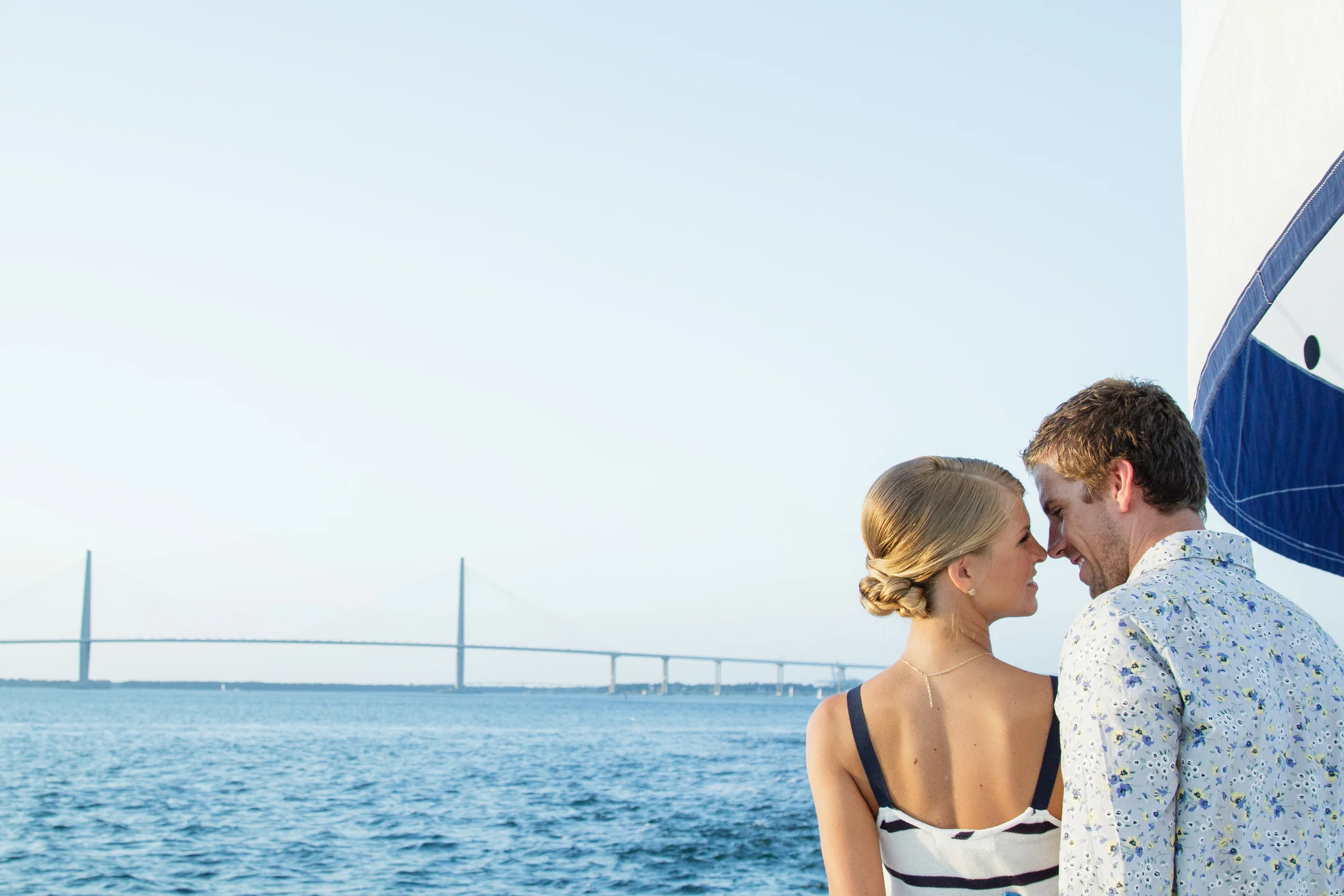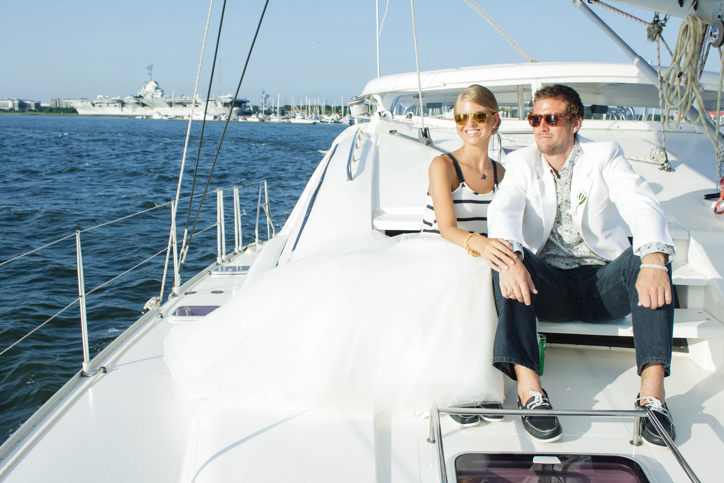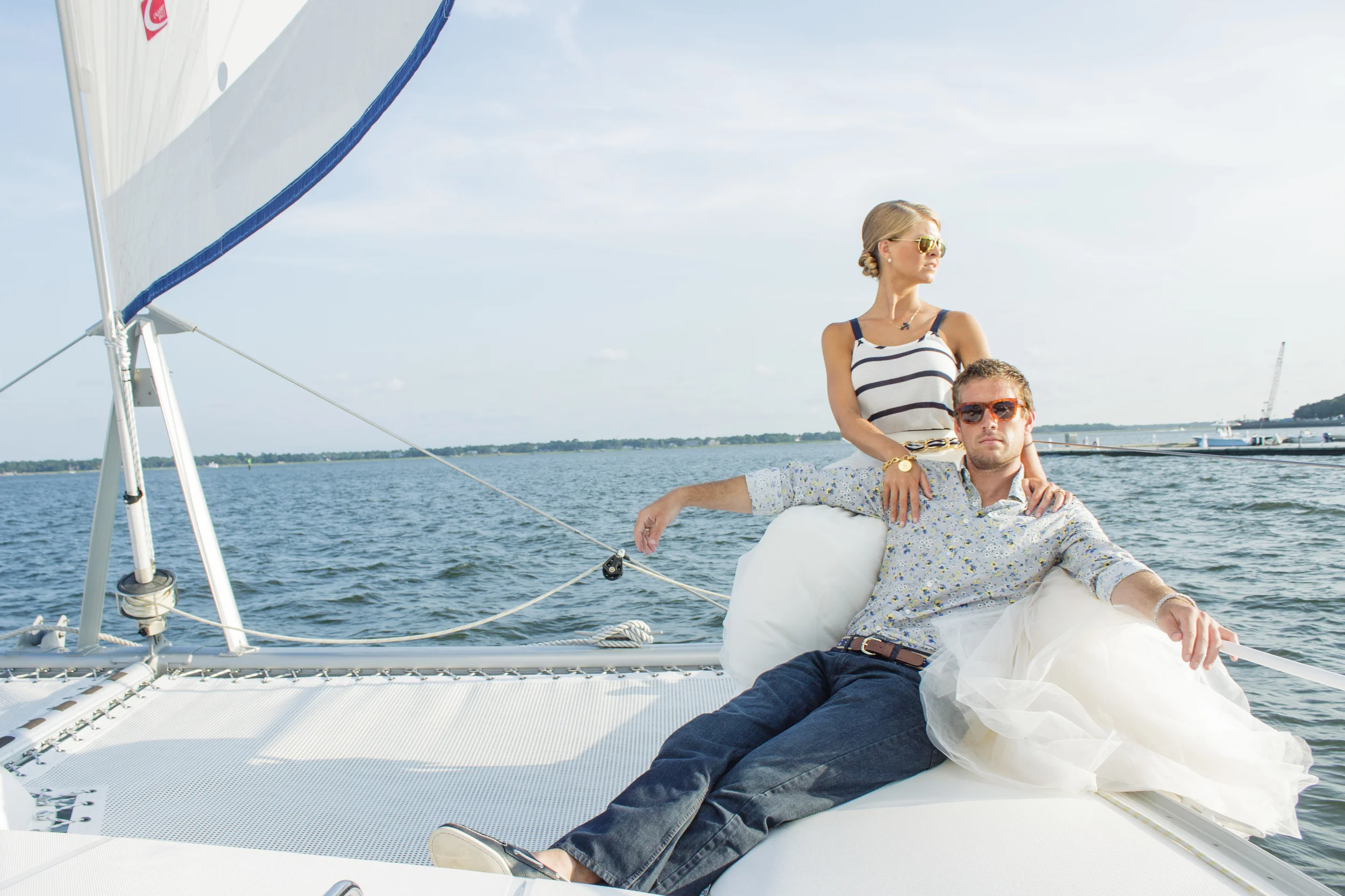 For our Grand Exit aboard the OM catamaran we took Kristen out of the boatnecked 3/4 sleeved shirt and rope necklace and put her in a fun white and blue tank top and a more casual anchor necklace. We changed Ben's solid blue shirt to a fun floral printed shirt from Banana Republic. Captain Banff Luther sailed us out around the peninsula, around the harbor and all over Charleston treating us to a KILLER sunset and unparalleled views of the Battery and all the way up to Fort Sumter. I'd highly recommend booking a cruise on his cat with your friends ASAP!