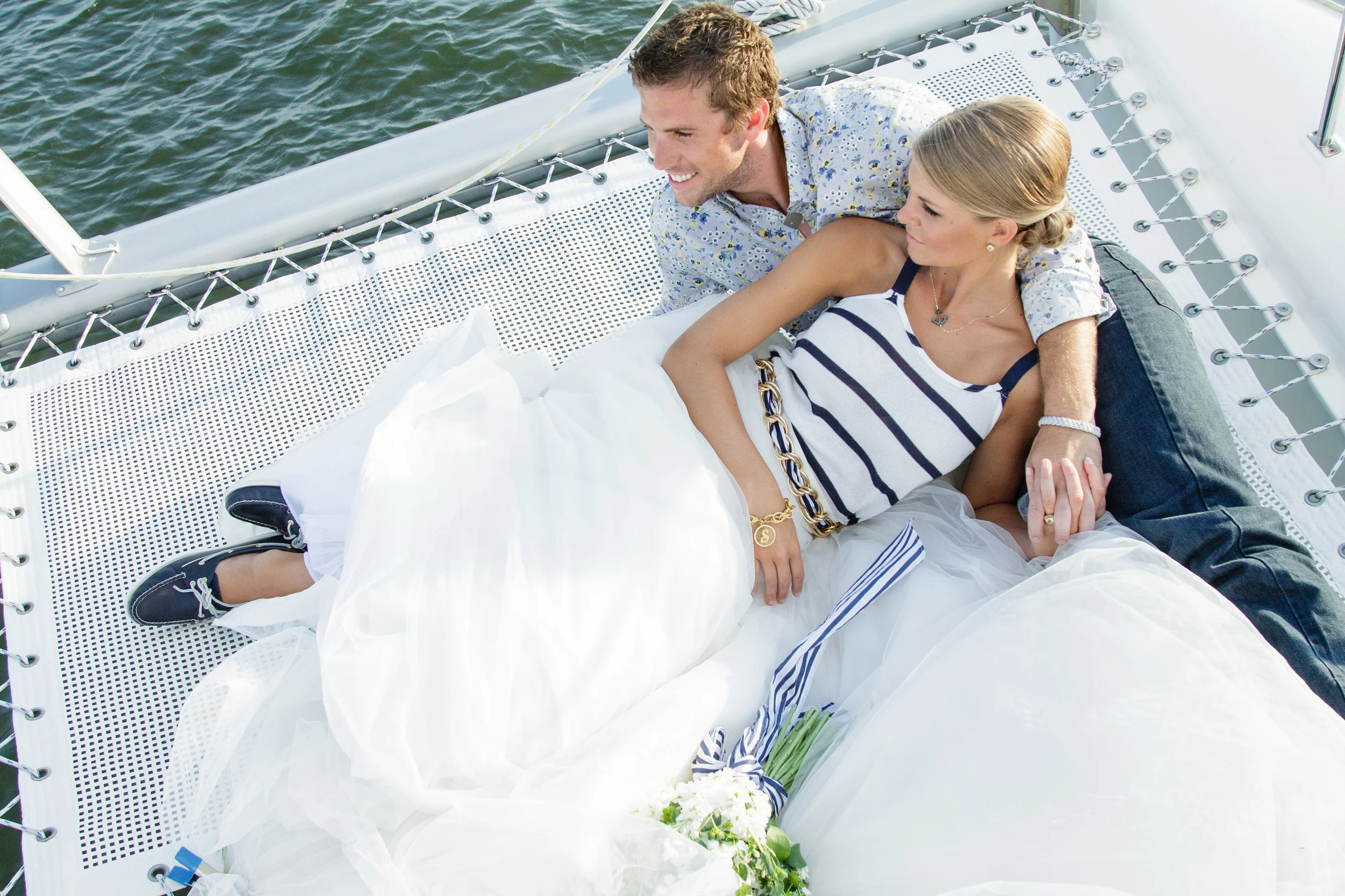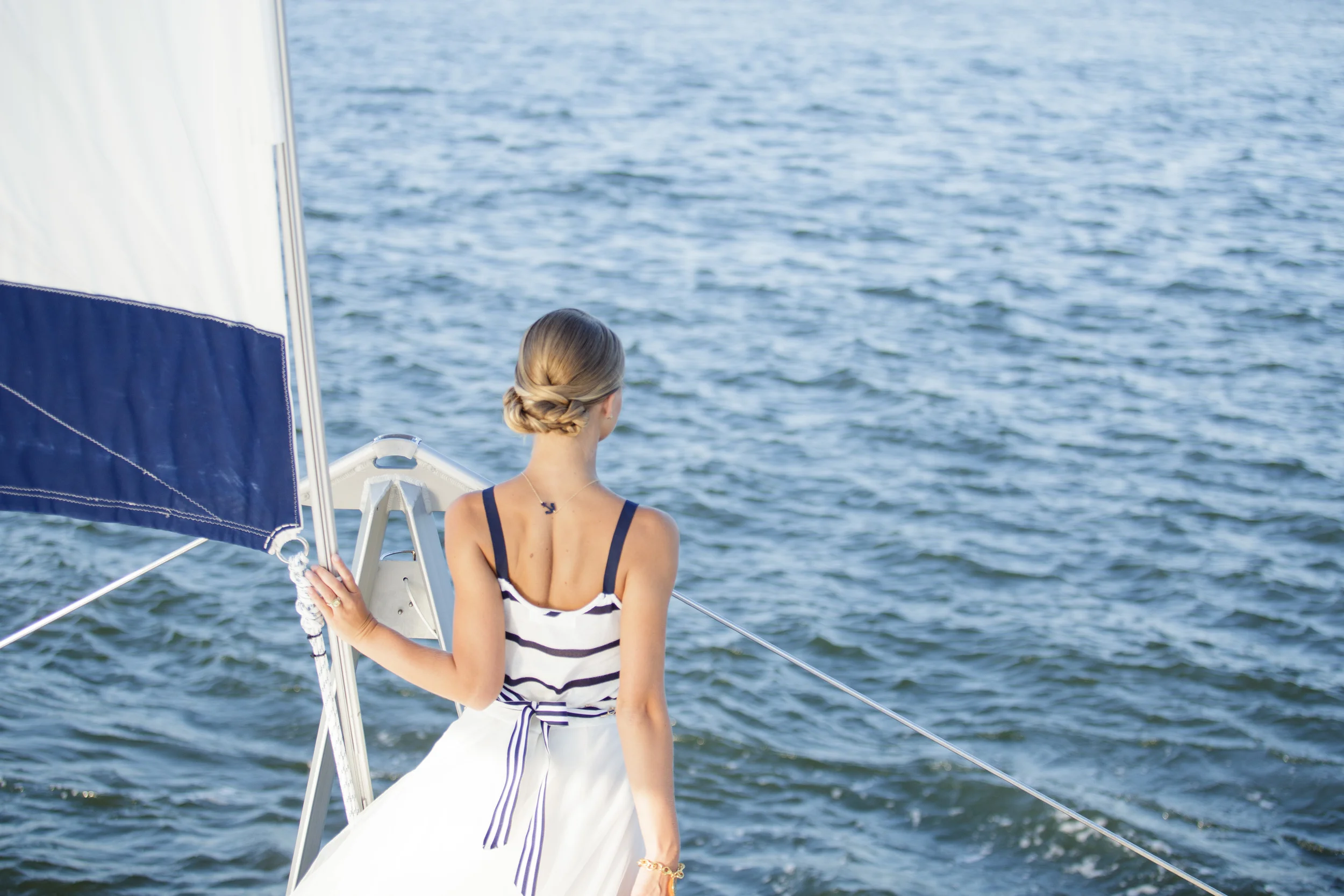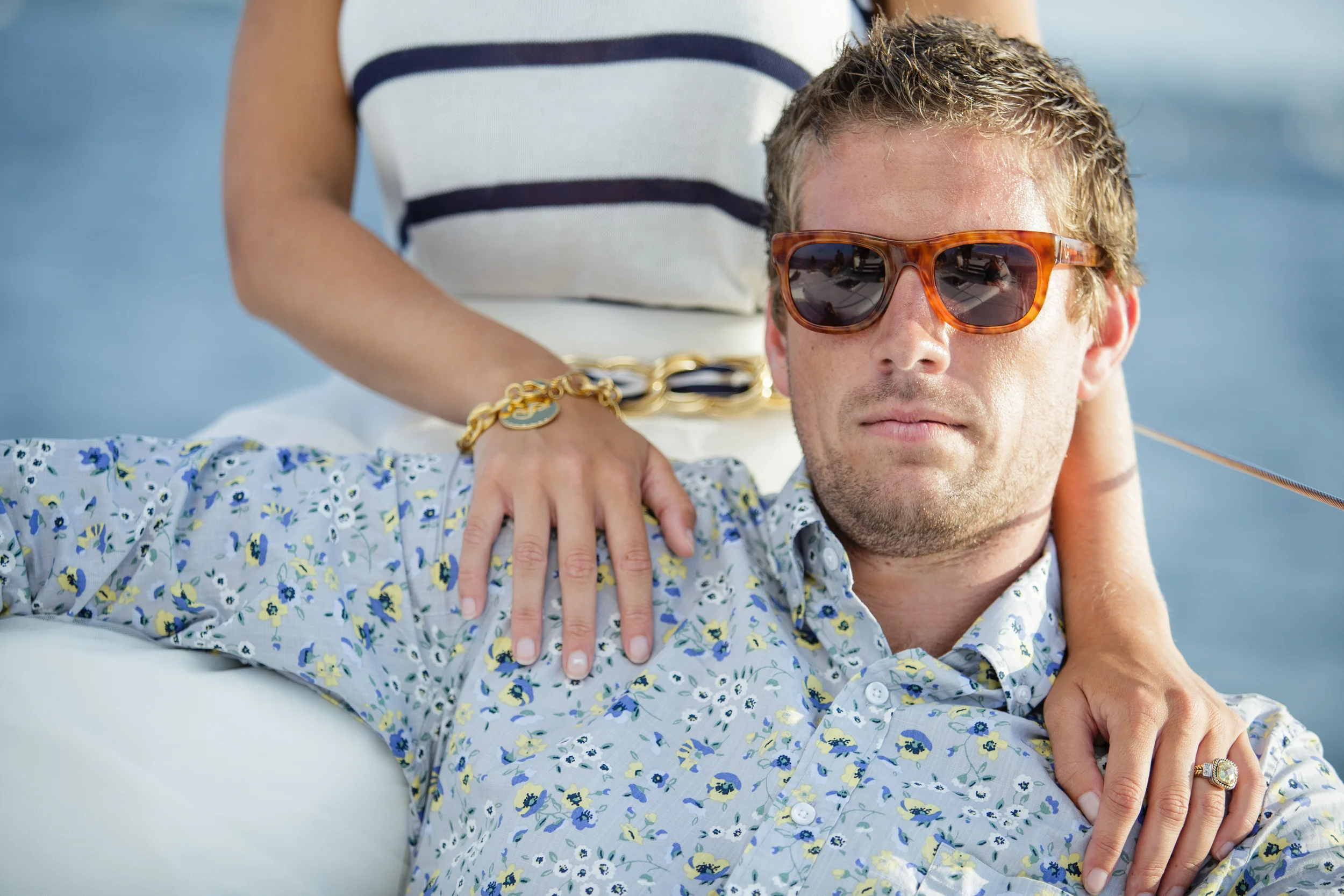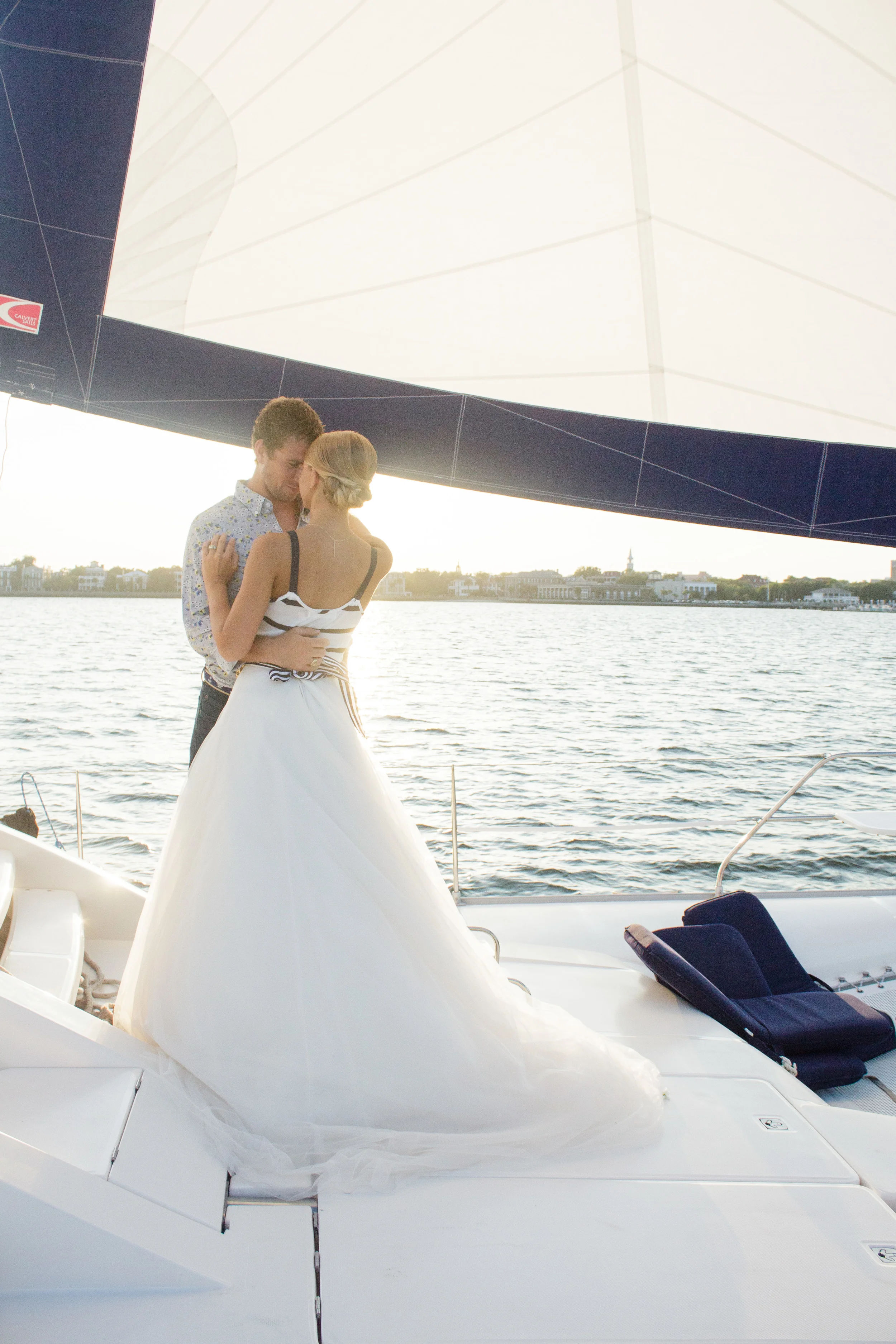 For our Grand Exit aboard the OM catamaran we took Kristen out of the boatnecked 3/4 sleeved shirt and rope necklace and put her in a fun white and blue tank top and a more casual anchor necklace. We changed Ben's solid blue shirt to a fun floral printed shirt from Banana Republic. Captain Banff Luther sailed us out around the peninsula, around the harbor and all over Charleston treating us to a KILLER sunset and unparalleled views of the Battery and all the way up to Fort Sumter. I'd highly recommend booking a cruise on his cat with your friends ASAP!